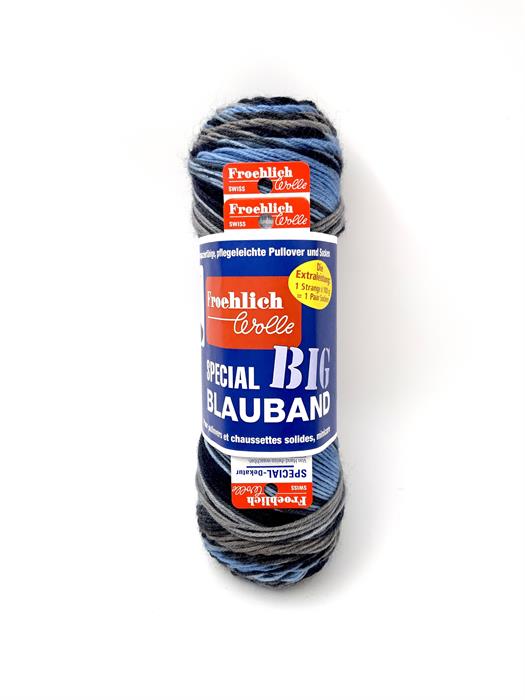 Die Sockenwolle Blauband von FROEHLICH gibt es als 50g oder 100g (BIG) Knäuel. Für ein Paar Socken bis Grösse 43 benötigen Sie 100g Blauband oder Marathon.