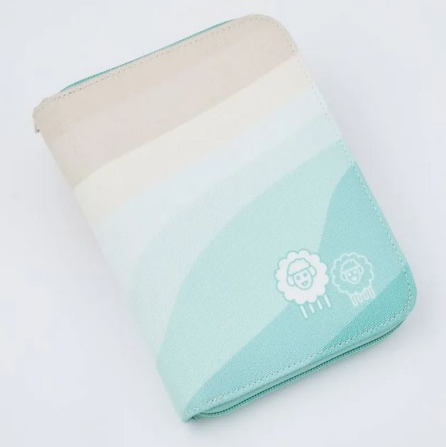 Verpackt in einem Stoff-Etui mit türkis-beigen Farbverlaufstönen, mit praktischem Reissverschluss