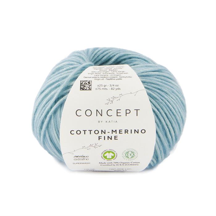 himmelblauCotton Merino Fine ist die kleine Schwester der beliebten Cotton Merino. Katia Concept hat hier mit der selben Technologie (ein Baumwollschlauch, in welchen feine Merinofasern eingeblasen werden) ein feineres Garn entwickelt, welches sich wunderbar für Baby und feinere Kreationen eignet.