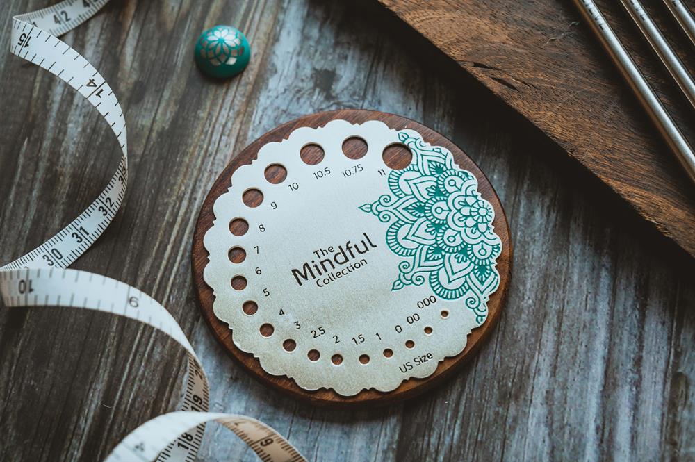 versilbertes Nadelmass verpackt in Baumwolltasche mit KordelzugEine wunderschöne Kollektion aus Edelstahl-Nadeln mit Lacespitzen, neuartiken 360° Swivel-Seilen, hochwertigen Sets und exklusivem Zubehör. Alle Nadeln sind mit einem Wort der Achtsamkeit beschriftet und die Nadel-Sets, Taschen, Accessoires mit einem Mandala-Motiv verziert.