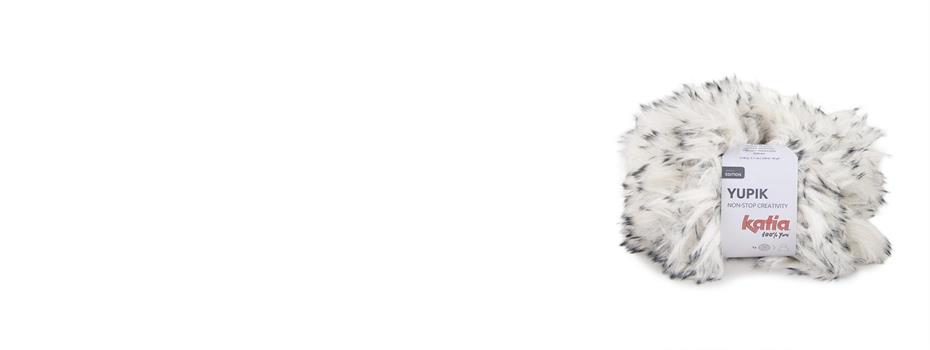 Katia Yupik ist ein Fantasiegarn mit Faux-Fur-Effekt und schön meliertem Look dank langer Fasern mit dunkleren Spitzen.